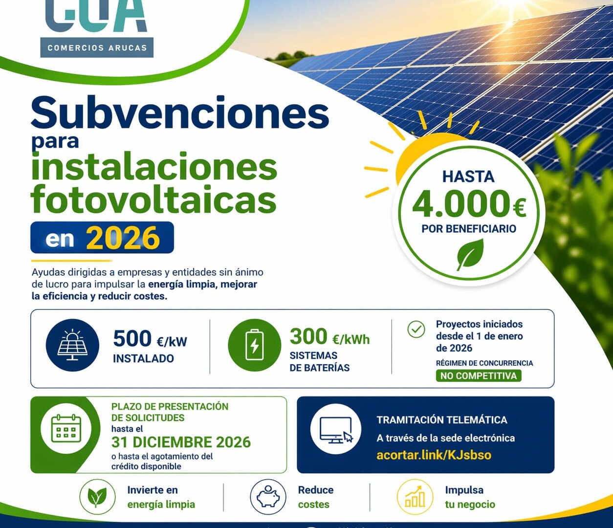 Desde *Comercios Arucas (COA)* queremos compartir una información de interés para el tejido empresarial local relativa a la convocatoria de subvenciones para instalaciones fotovoltaicas dirigida a empresas y entidades sin ánimo de lucro, publicada en el Boletín Oficial de la Provincia de Las Palmas (BOP nº 45, de fecha 15 de abril de 2026).